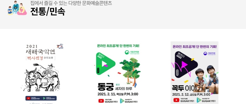 ▪ 2021 새해 국악연주(국립국악원), 한류 아이돌이 소개하는 설·음식문화 모꼬지 라이브(한국국제문화교류진흥원) 등